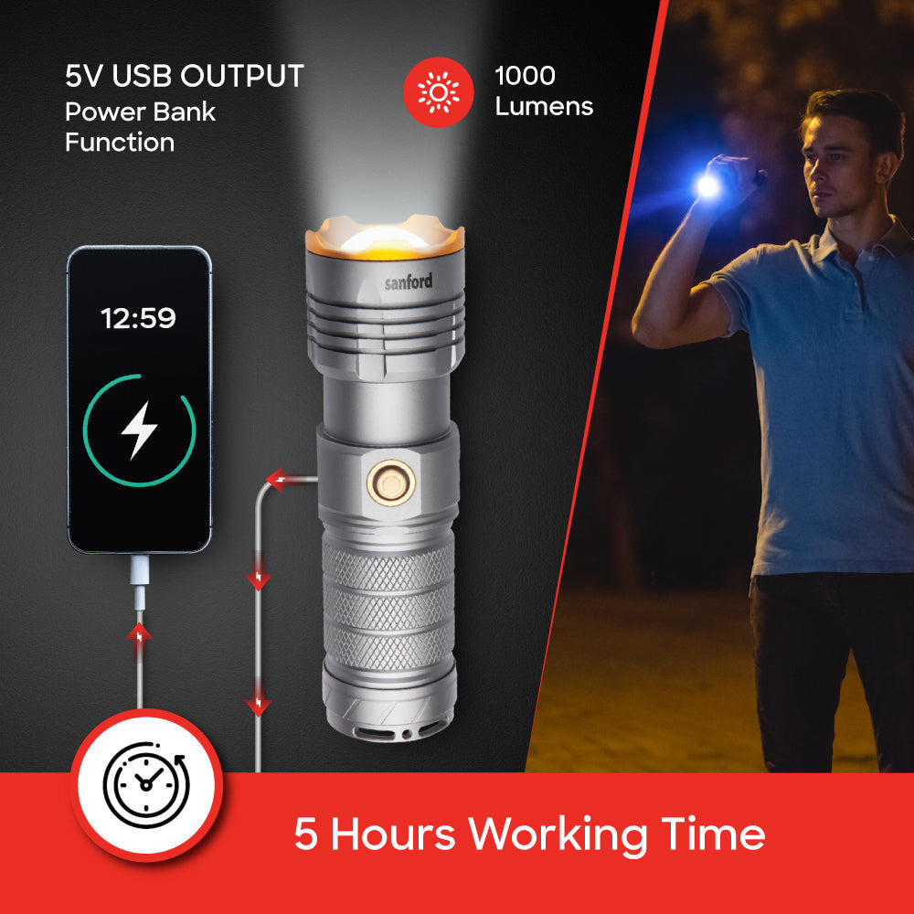 Ang Sanford 20W LASER LED Flashlight ay isang high-performance, masungit na tool sa pag-iilaw na ginawa para sa matinding tibay at versatility. Nagtatampok ng hindi nababasag na aerospace-grade aluminum body, isang malakas na 20W LASER LED, at dalawahang 3.7V 9000mAh Li-ion na baterya (18650 x 2), ang flashlight na ito ay naghahatid ng pambihirang liwanag at pagiging maaasahan. Sa pag-zoom function nito, maramihang lighting mode, at kahanga-hangang 2800-meter range, perpekto ito para sa mga outdoor adventure, emergency, at propesyonal na paggamit. Bukod pa rito, ang 5V USB output power bank function nito ay nagdaragdag ng karagdagang utility sa pamamagitan ng pagpapahintulot sa iyong mag-charge ng mga device on the go.