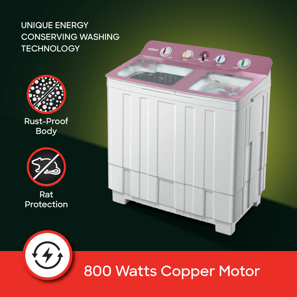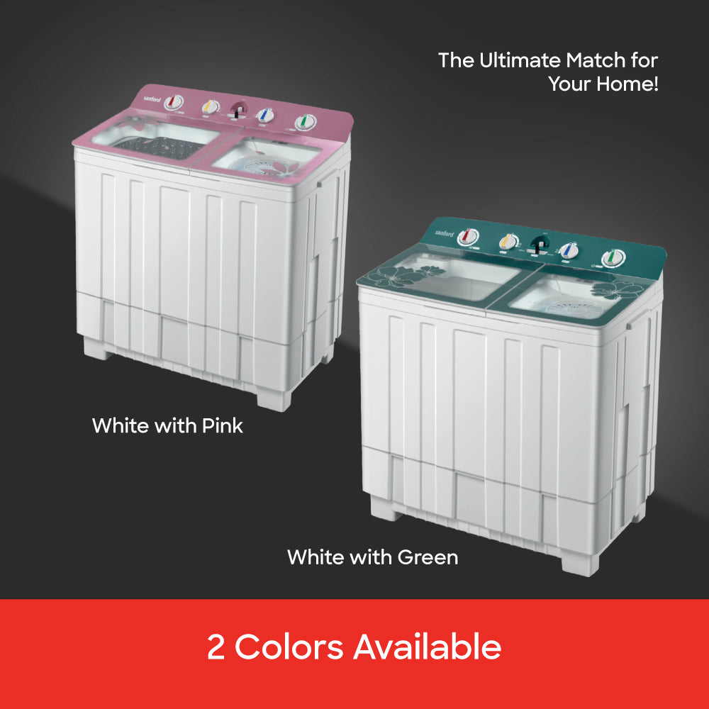 The Sanford Semi Automatic Washing Machine is a powerful and reliable appliance designed to handle the toughest laundry challenges with ease. With a generous 15kg wash capacity and an 8kg spin capacity, it minimizes the number of wash cycles, saving time and effort for busy households. Featuring a sleek tempered glass cover, a 100% copper motor, and advanced functionalities like program selection and a cleaning filter, this machine combines style, durability, and performance. Its spin speed of 1350 RPM ensures quick drying, while safety features like an anti-rat base and motor protector guarantee long-lasting reliability.