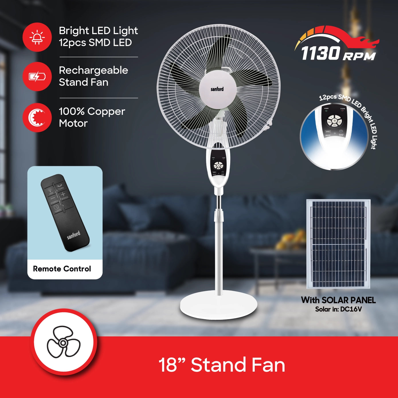 Sanford 18” Rechargeable Stand Fan | 9 Speeds | LED Light | Adjustable Height | AC/DC Operation | 60W Copper Motor