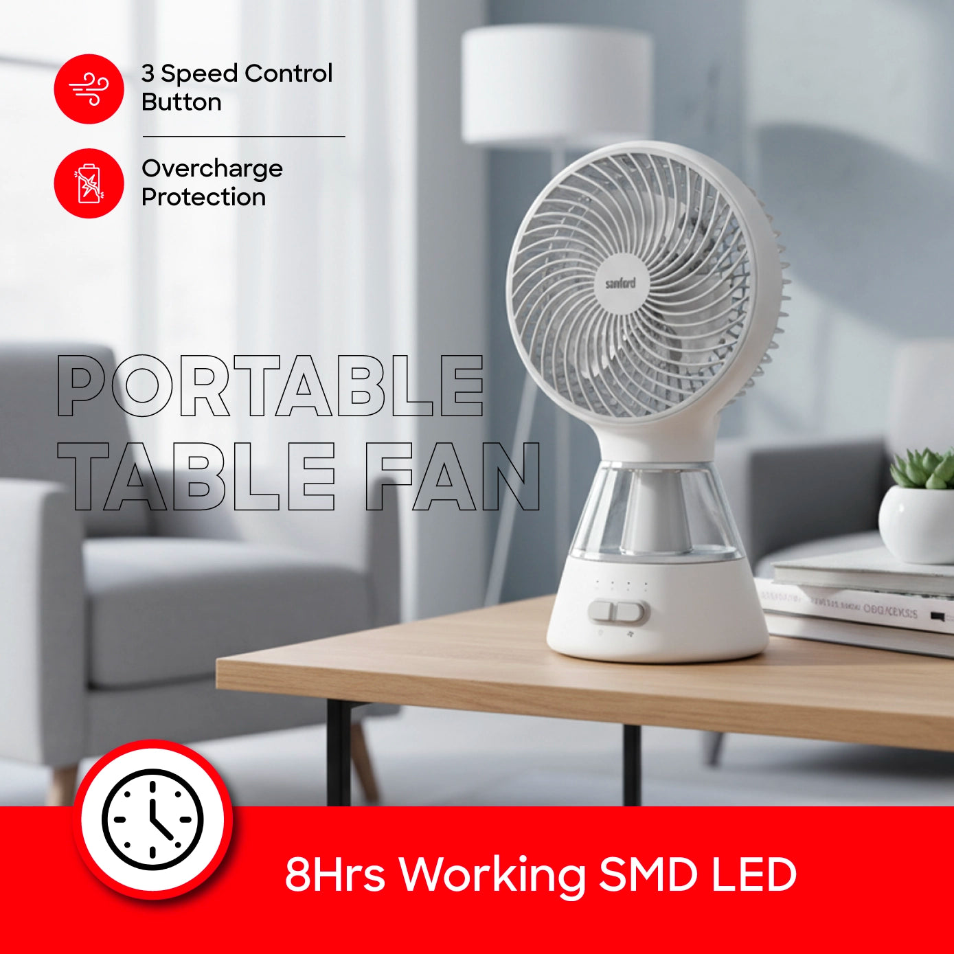 Sanford 6-Inch Rechargeable Table Fan with 12 SMD LED Lights | 3-Speed Control | 1500mAh Battery | 5H Fan Runtime | 8H LED Runtime | USB Charging | Compact & Portable