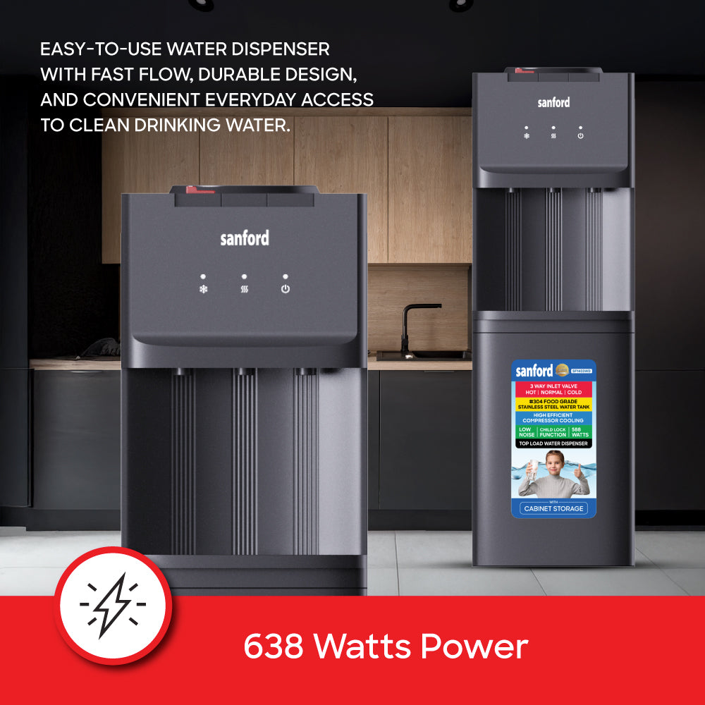 Experience convenient hydration with the Sanford Top Load Water Dispenser, model SF1403WD. Designed for modern homes and offices, it offers hot, normal, and cold water options through a 3-tap dispensing system. Built with a SUS304 stainless steel water tank and high efficient compressor cooling, it ensures consistent temperature performance and long-lasting durability. The child lock function and low-noise design enhance safety and comfort, while the built-in cabinet storage provides extra space for bottles or accessories. Crafted with a food-grade ABS body, this dispenser combines function, hygiene, and energy efficiency in one sleek unit. Enjoy Sanford reliability and refreshing convenience every day.