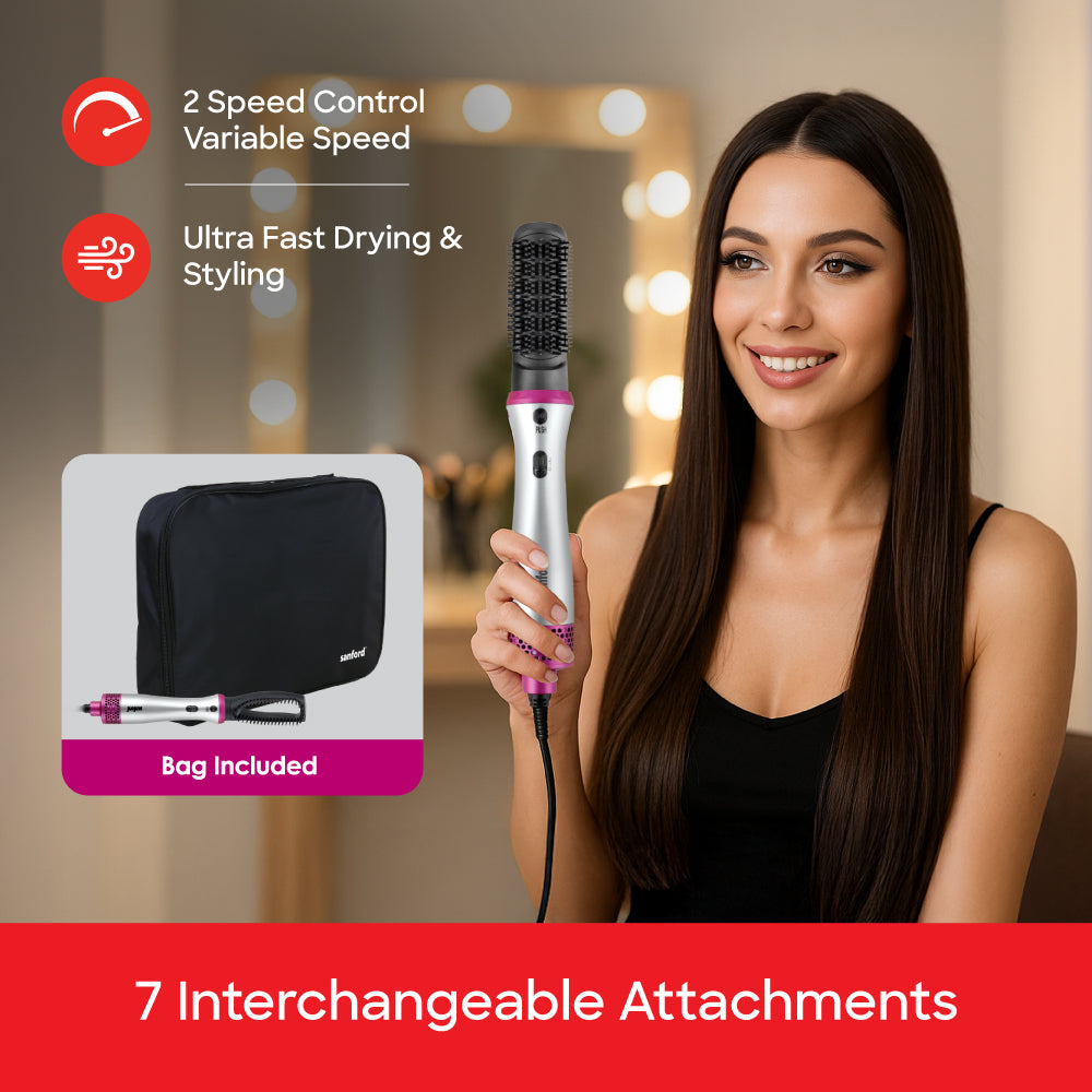 • 7 Interchangeable Attachments: Includes a range of tools to suit all your styling needs, from drying to curling and straightening.
