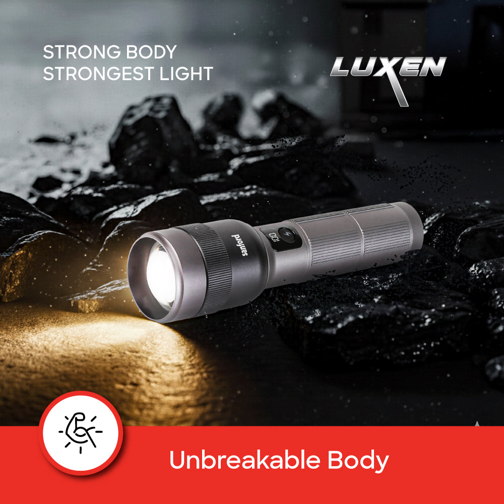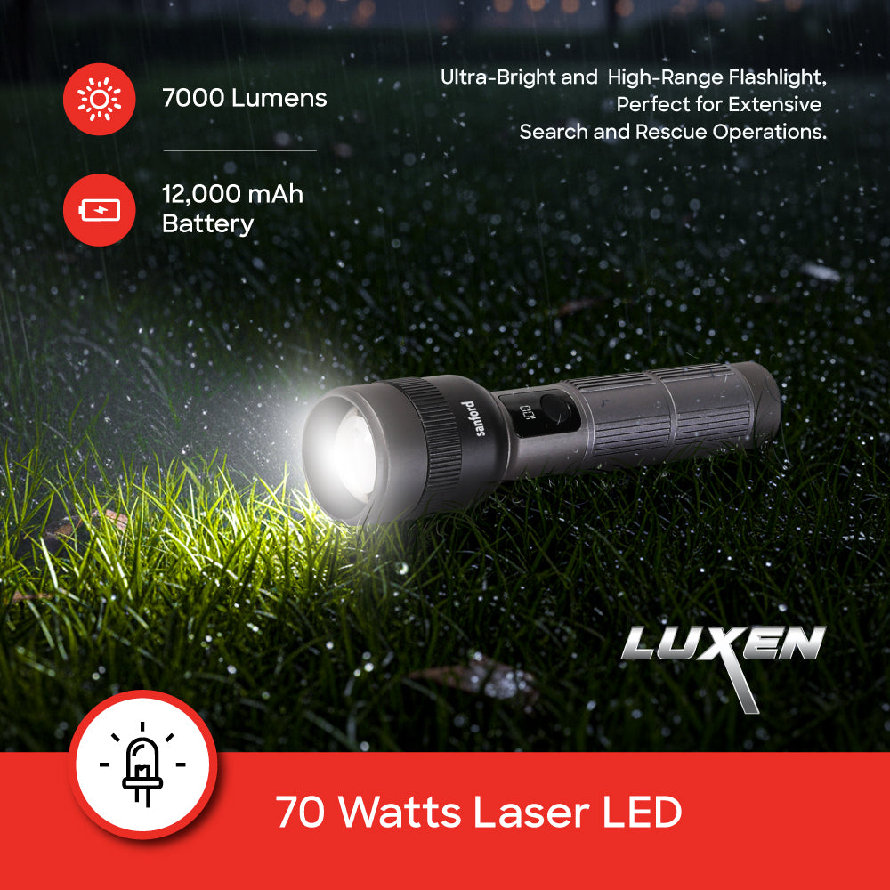 Experience dependable brightness with the Sanford Rechargeable LED Flashlight Torch, model SF6217SL. Engineered for superior lighting performance, it features a 70W laser LED delivering up to 7000 lumens of brilliance. The 12,000mAh lithium-ion battery ensures extended operation, while the Type-C USB charging port enables quick and efficient recharging. Its advanced zoom function offers precise beam control, with five lighting modes including Low, Medium, High, Strobe, and SOS. Designed with a digital LED display and USB output power bank function, it combines practicality and power for outdoor, home, or professional use. Constructed from aircraft-grade aluminum, it guarantees strength, durability, and long-lasting performance. Sanford lighting — reliability you can see.