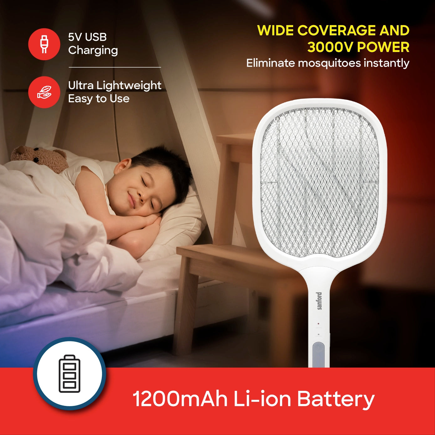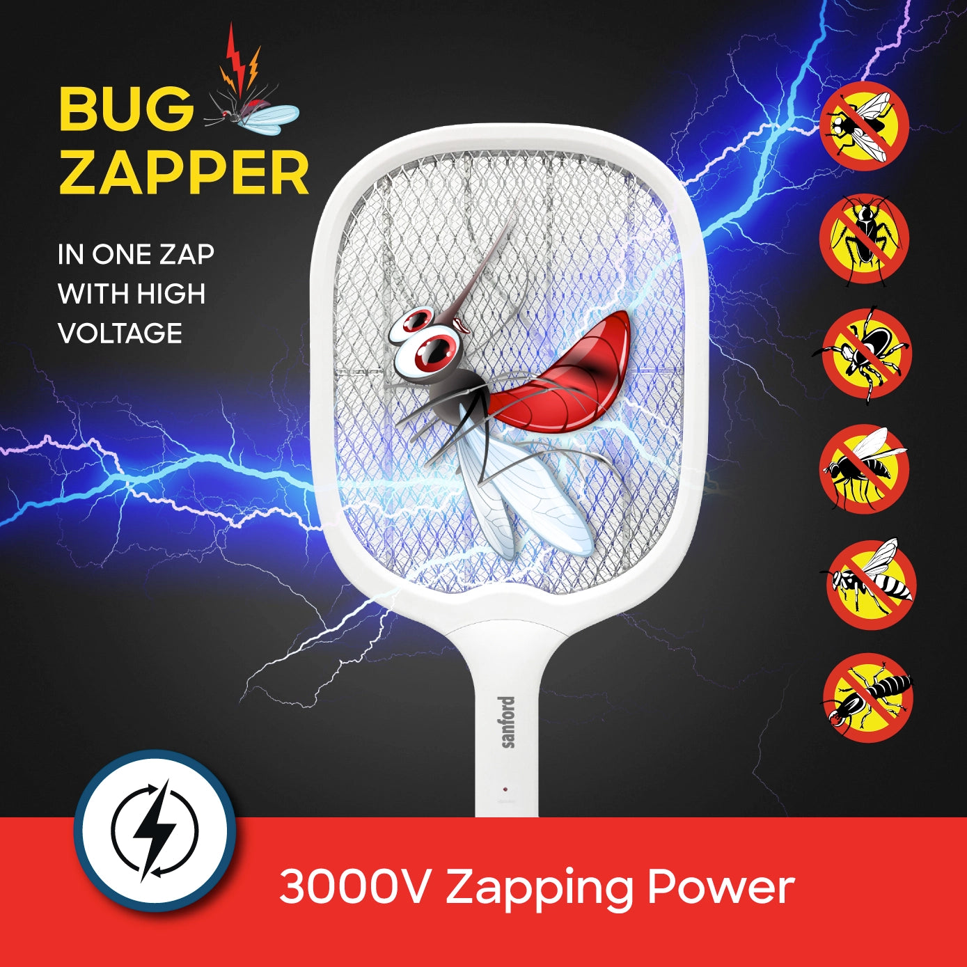 Protect your family with the Sanford Rechargeable Mosquito Bat with Stand (SF635MK), engineered for safe and efficient mosquito control. Equipped with a 3500V high-voltage zapping grid and an advanced UV LED mosquito trapping light, it eliminates flying insects instantly and effectively. Its lightweight design with a dedicated stand ensures convenience and easy storage.